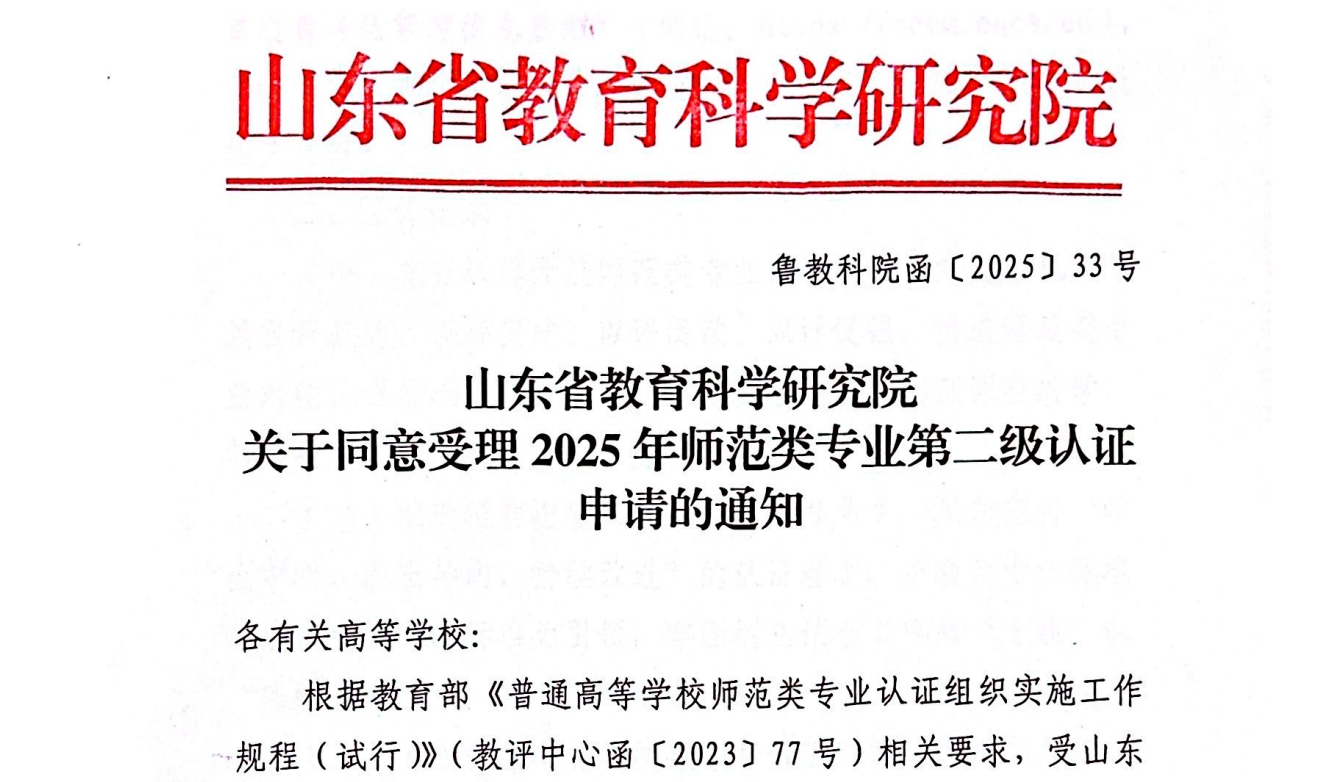 近日,山东省教育科学研究院发布《关于同意受理2025年师范类专业第二级认证申请的通知》(鲁教科院函〔2025〕33号),我校美术学专业师范类专业第二级认证申请喜获受理。此次全省共有15所高校的31个师范类专业认证申请获得受理。